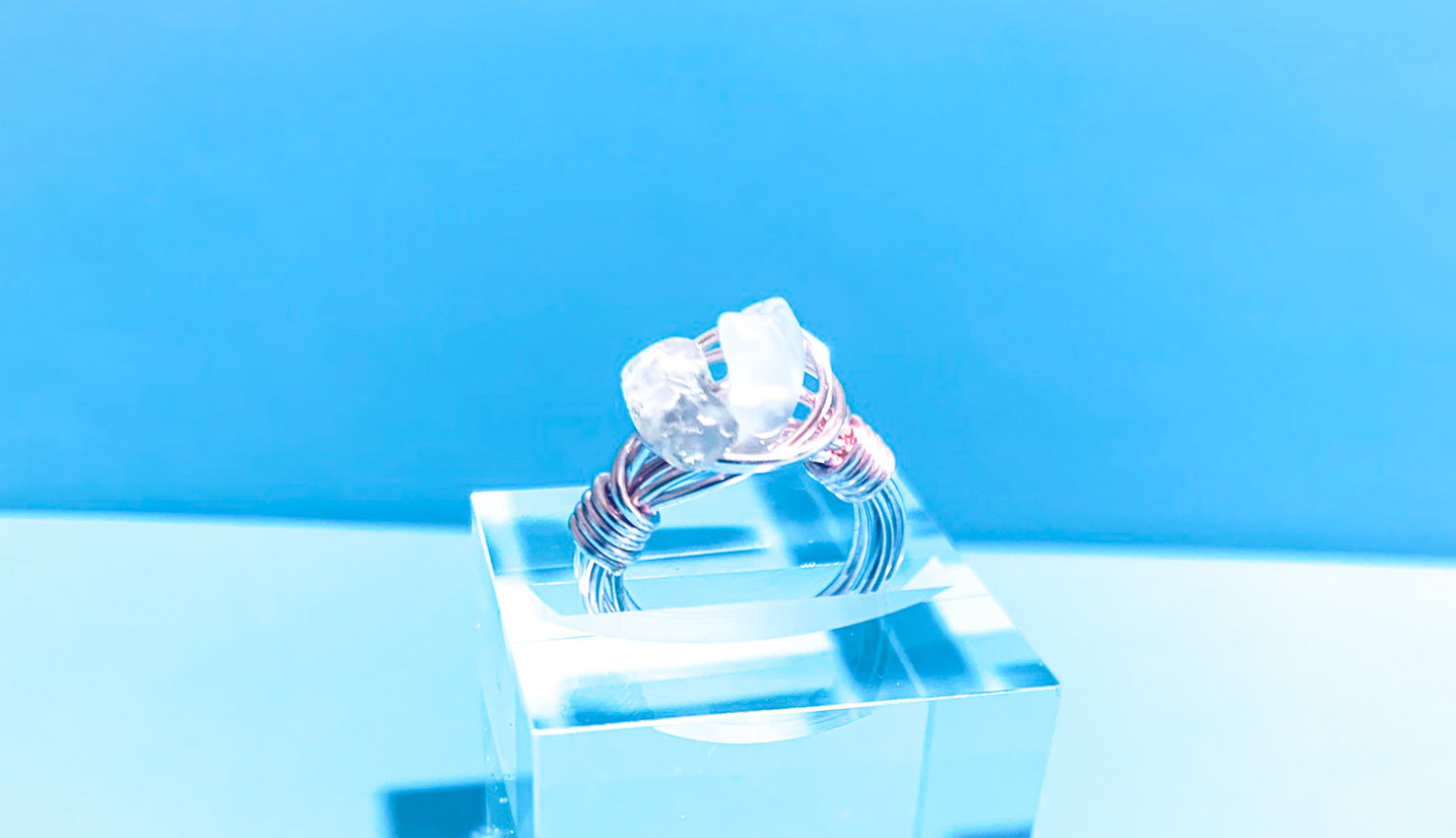 Mimi is a dainty little ring that centers two little rose quartz crystals and sits perfect on your pinkie finger.